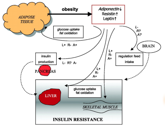 Fat cells convert a male hormone known as androstenedione to female hormone called estrone. Estrone affects the metabolism of the part of brain that regulates ovarian & testicular function.